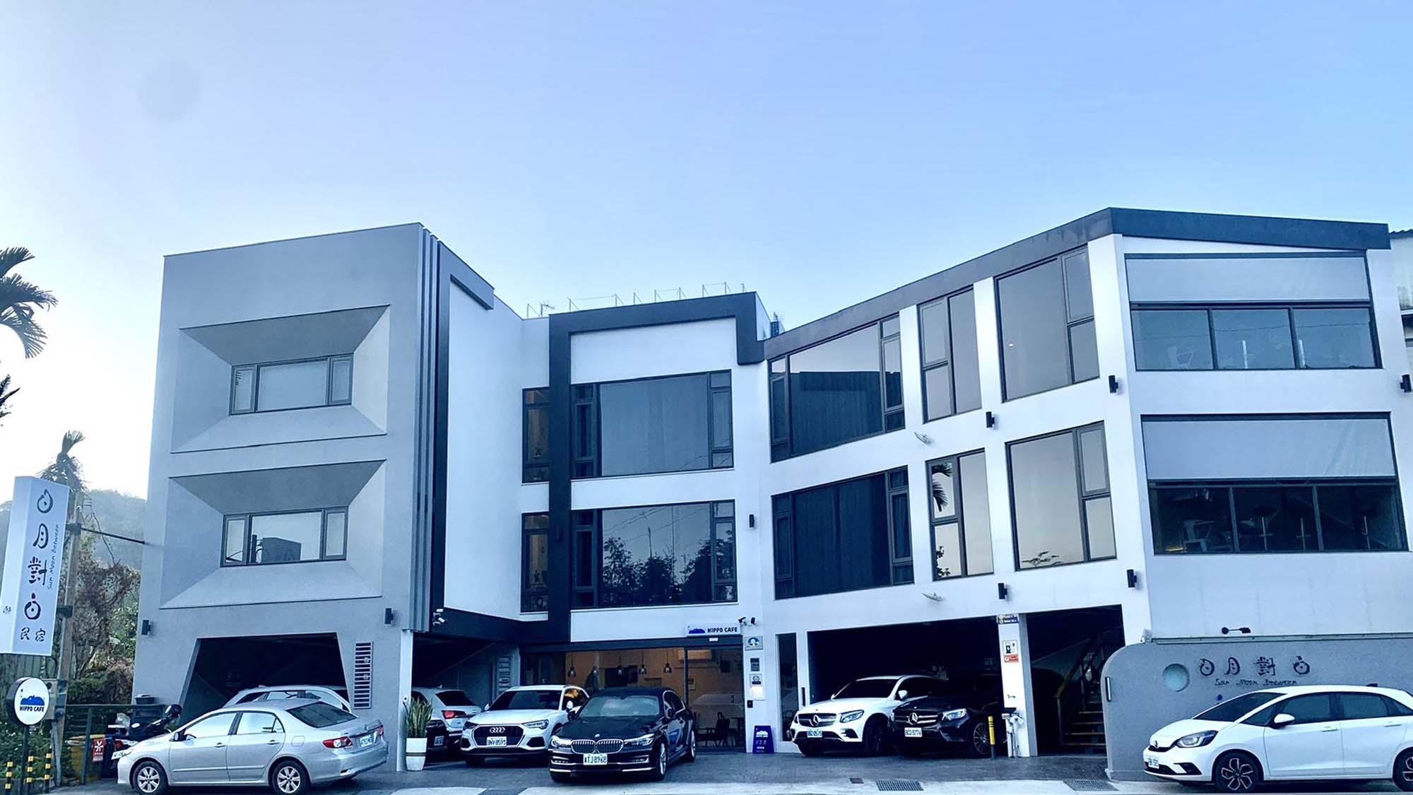 「日月潭‧日月對白民宿」黑白灰相間的外觀時尚有型,民宿戶外提供有一般停車格與電動車專用位,一樓則為餐廳,整棟採用多面落地窗讓陽光恣意潑灑進屋,使空間盡顯慵懶無拘。